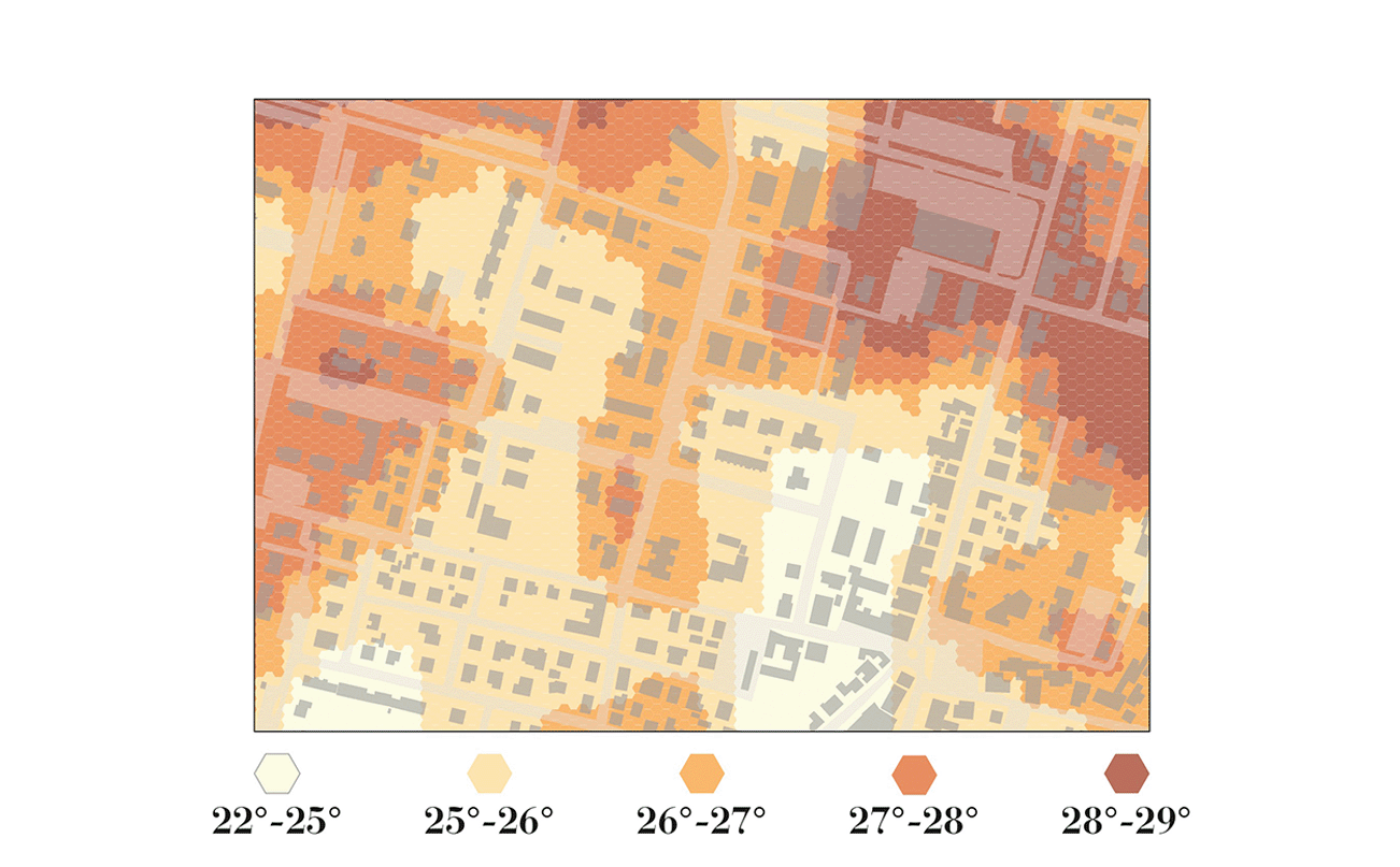 Pur prendendo forma da una visione complessiva di trasformazione dell’area, lo spazio pertinenziale pubblico viene disegnato congiuntamente al nuovo corpo edilizio, al fine di inserire scelte progettuali che contribuiscano a riproporre attraverso la rilettura di alcuni caratteri (iconemi) “architettonici” e “rurali”; elementi come le gelosie ed i materiali (mattoni in laterizio e legno) trovano un impiego in alcuni componenti che sono reinterpretati nel progetto di suolo. Il disegno dello spazio pubblico avviene, quindi, anche attraverso il “recupero” degli elementi e materiali identiari e testimoniali, che trovano un riscontro progettuale in elementi verticali (alcuni setti divisori in mattone), orizzontali (alcune tracce di bordatura) o nei rivestimenti e finiture (come per esempio nel teatro all’aperto e nell’area attrezzata).