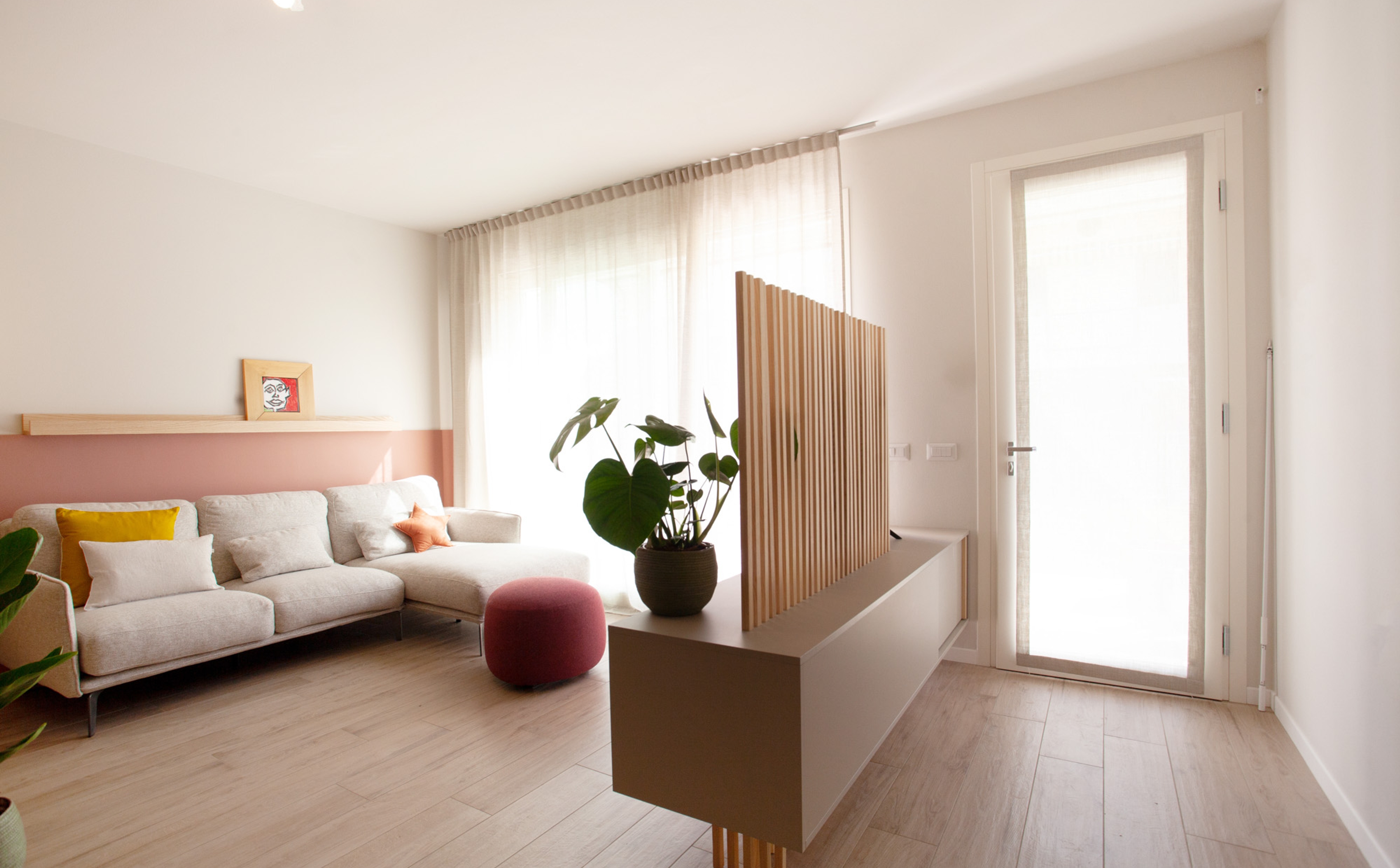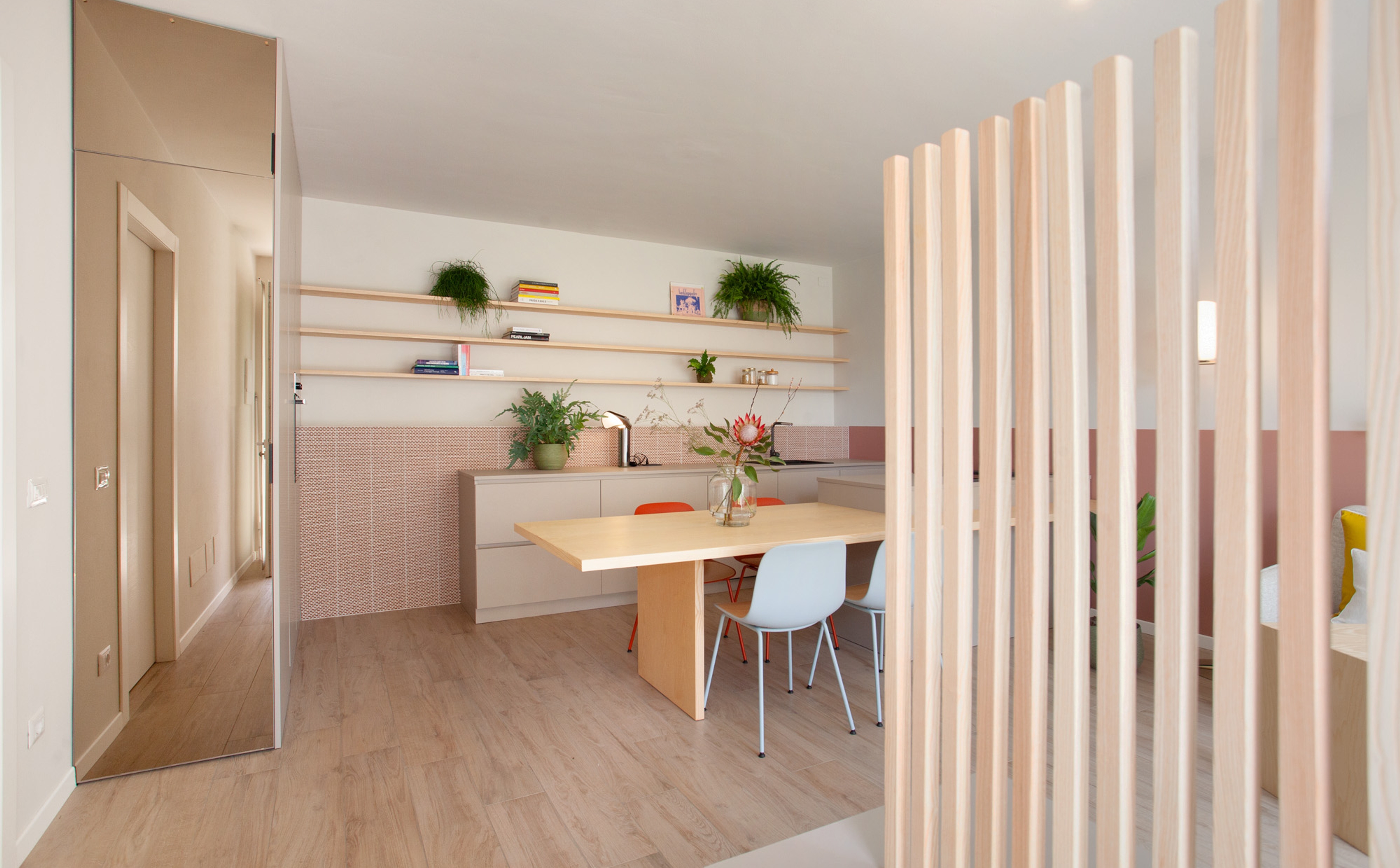 Grazie alla forte luminosità dello spazio è stata sfruttata la forza del colore e del pattern delle cementine.
